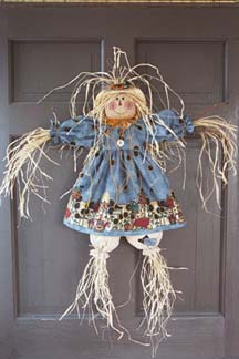 This 24" Scarecrow girl designed to hang on your door or wall. She has grapevine twig arms and a colorful border print dress. Price $7.50