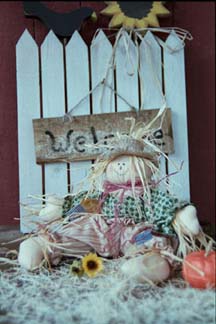 A 7" scarecrow that will look great on your table in the fall. His sign reads "Welcome to my garden".