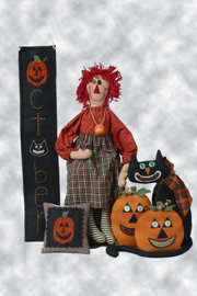 This pattern includes directions to make each of the items shown in the photograph. A primitive Ann, A banner, a pillow, and a cat with pumpkins. Price $7.50