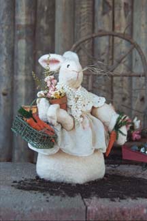 Bunnie Mae is also 12" tall. She has a lace collar, apron, a flower pot, and garden basket. Price $7.50