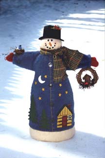 Stanley Snowman is 23" tall and is made from plush felt and Warm and Natural. He has the moon and the stars above a small cabin on his jacket. Price $7.50