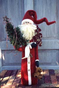 Slim Santie is 27" tall and is made from plush felt. He has his list, a tree, and a Teddy bear for a gift. He is weighted to stand. His hat and scarf can be bent to the shape you desire.